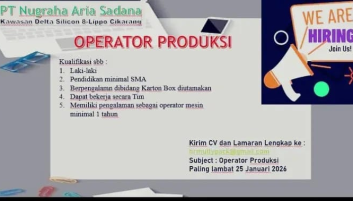 PT Nugraha Aria Sadana, perusahaan yang berlokasi di Kawasan Delta Silicon 8 – Lippo Cikarang, saat ini sedang mencari individu yang berdedikasi untuk bergabung dengan tim kami sebagai Operator Produksi. Jika Anda memiliki pengalaman di industri manufaktur dan siap bekerja dalam tim, ini adalah kesempatan karir yang tepat untuk Anda.
