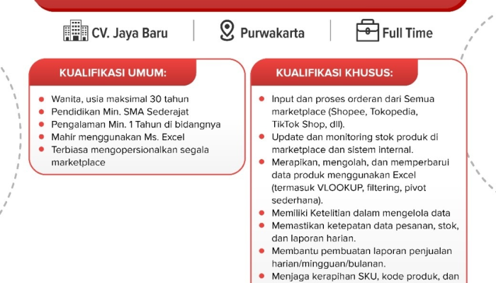 - Admin Marketplace: Wanita (maks. 30 thn), min. SMA, mahir Excel (VLOOKUP/Pivot), berpengalaman mengelola stok dan pesanan di berbagai marketplace.