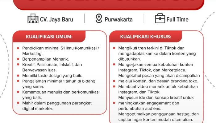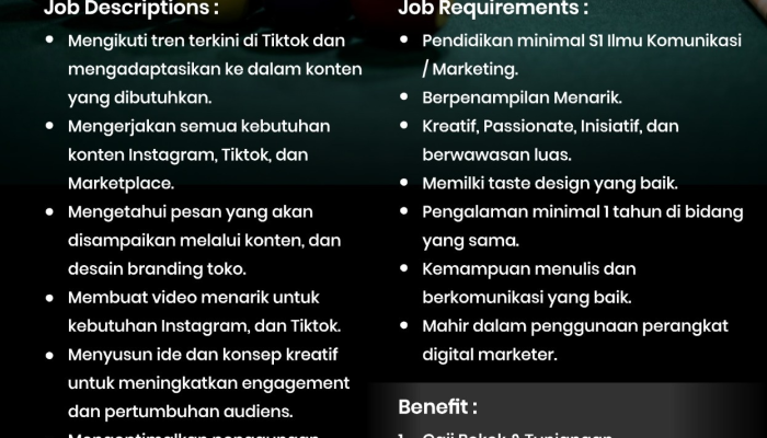 - Content Creator: Pendidikan min. S1 (Ilmu Komunikasi/Marketing), pengalaman min. 1 tahun, mahir membuat video untuk TikTok/Instagram, dan memiliki taste desain yang baik.
