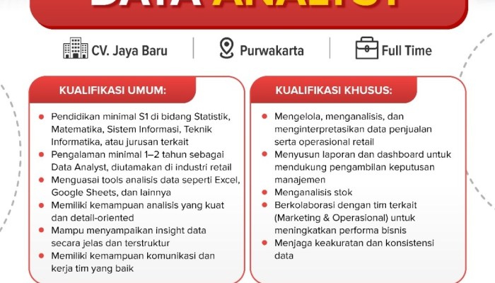 - Data Analyst: Pendidikan min. S1 (Statistik/Matematika/IT), pengalaman 1-2 tahun, mahir Excel/Google Sheets, dan mampu memberikan insight data penjualan.