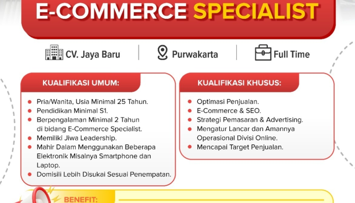 - E-Commerce Specialist: Pria/Wanita (min. 25 thn), pendidikan min. S1, pengalaman min. 2 tahun, mahir SEO, strategi iklan, dan optimasi penjualan online.