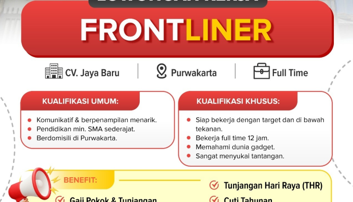 - Frontliner: Pendidikan min. SMA, memahami dunia gadget, siap bekerja 12 jam dengan target, komunikatif, dan berpenampilan menarik.