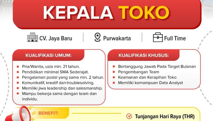 - Kepala Toko: Pria/Wanita (min. 21 thn), pendidikan min. SMA, pengalaman min. 2 tahun di posisi yang sama, memiliki jiwa kepemimpinan, dan mampu menganalisis data.