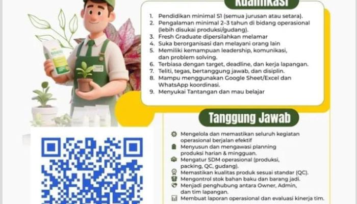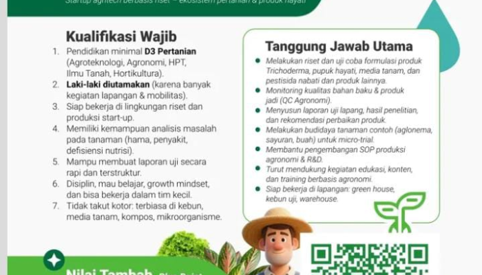 - Pendidikan minimal D3 Pertanian (Agroteknologi, Agronomi, HPT, Ilmu Tanah, atau Hortikultura).