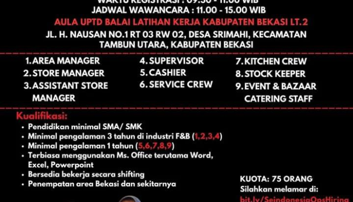Apakah Anda sedang mencari tantangan baru di industri Food & Beverage (F&B)? Se’Indonesia, jaringan restoran yang sedang berkembang pesat, mengundang Anda untuk bergabung dalam acara Walk In Interview besar-besaran di Kabupaten Bekasi. Ini adalah kesempatan emas bagi Anda yang ingin berkarir di perusahaan yang dinamis dengan berbagai pilihan posisi mulai dari operasional store hingga level manajerial.