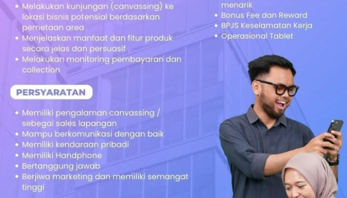 - Pengalaman: Memiliki pengalaman canvassing / sebagai sales lapangan sangat diutamakan.