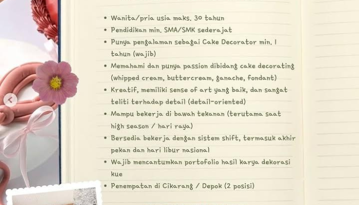- Pengalaman: Wajib memiliki pengalaman minimal 1 tahun sebagai Cake Decorator.