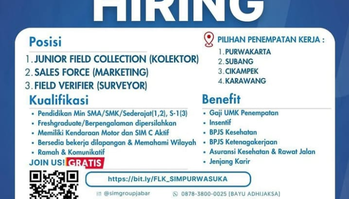 Apakah Anda lulusan SMA/SMK yang sedang mencari peluang kerja di perusahaan besar? Ingin berkarir di bidang pembiayaan dan pemasaranan? FIFGROUP sedang membuka kesempatan emas untuk Anda! Kami mencari individu yang bersemangat, komunikatif, dan siap ditempatkan di wilayah Purwakarta, Subang, Cikampek, atau Karawang.