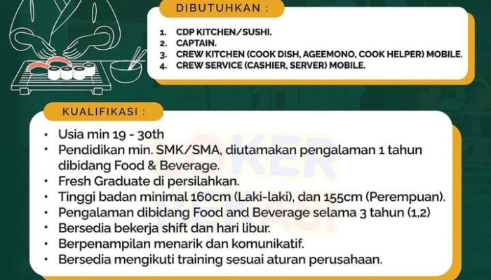 - Kualifikasi Khusus: Diutamakan memiliki pengalaman di bidang F&B selama 3 tahun.