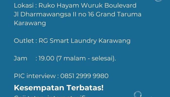 - Outlet Kerja:Â RG Smart Laundry Karawang