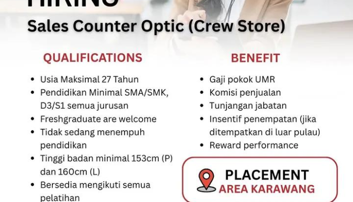 Kami mengundang Anda yang berdomisili di Karawang dan sekitarnya untuk menjadi bagian dari tim profesional kami dan tumbuh bersama brand yang telah terpercaya selama puluhan tahun dalam memberikan solusi penglihatan terbaik bagi masyarakat.