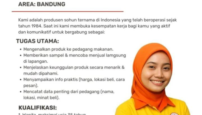 Apakah Anda seorang wanita yang aktif, komunikatif, dan bersemangat mencari peluang kerja di area Bandung? Inilah kesempatan emas Anda! Sohun Kembang Matahari, produsen sohun ternama di Indonesia yang telah beroperasi sejak tahun 1984, sedang mencari individu yang aktif dan komunikatif untuk bergabung sebagai Promotor Lapangan.