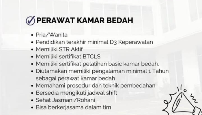 • Pengalaman: Diutamakan memiliki pengalaman minimal 1 tahun sebagai perawat kamar bedah.