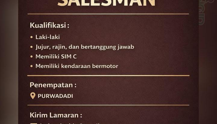 - Keahlian: Memiliki kemampuan komunikasi yang baik dan berorientasi pada target (pengalaman di bidang salesman bahan bangunan menjadi nilai plus).