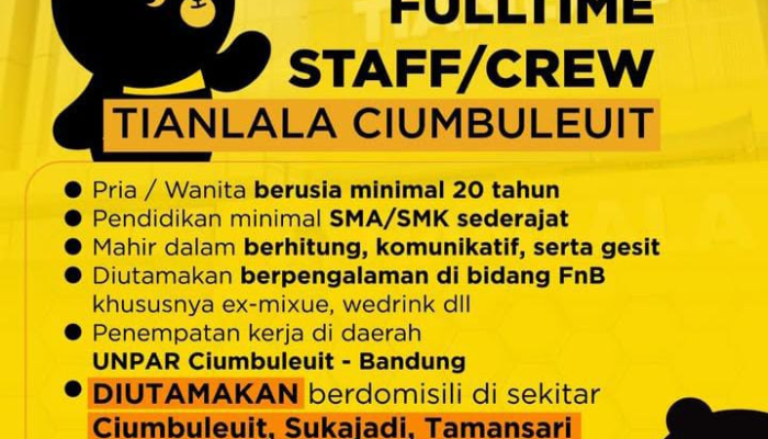 Tianlala Ciumbuleuit – salah satu outlet minuman kekinian yang sedang digemari – sedang membuka lowongan untuk posisi Fulltime Staff/Crew. Kami mengundang individu Pria/Wanita yang berdomisili di sekitar Ciumbuleuit, Sukajadi, Tamansari, dan sekitarnya untuk bergabung dengan tim kami yang ceria dan profesional.