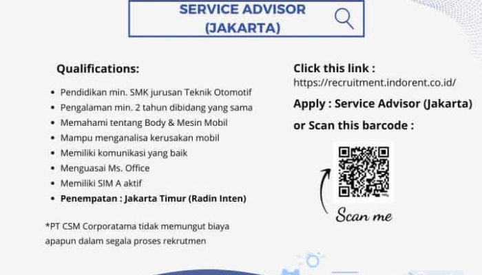 Penting: PT CSM Corporatama (INDORENT/Indomobil Group) TIDAK memungut biaya apapun dalam seluruh proses rekrutmen. Waspada terhadap segala bentuk penipuan yang mengatasnamakan perusahaan.