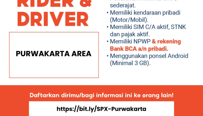 Apakah Anda mencari lowongan kerja di Purwakarta sebagai rider atau driver dengan persyaratan yang mudah? Jika Anda memiliki semangat kerja tinggi, terorganisasi, dan siap menjadi garda terdepan dalam pengiriman paket cepat, ini adalah kesempatan yang tepat! SPX Express sedang membuka rekrutmen besar-besaran untuk posisi Rider & Driver yang akan beroperasi di Area Purwakarta. Segera daftarkan diri Anda dan raih karir stabil di salah satu perusahaan logistik terdepan di Indonesia!