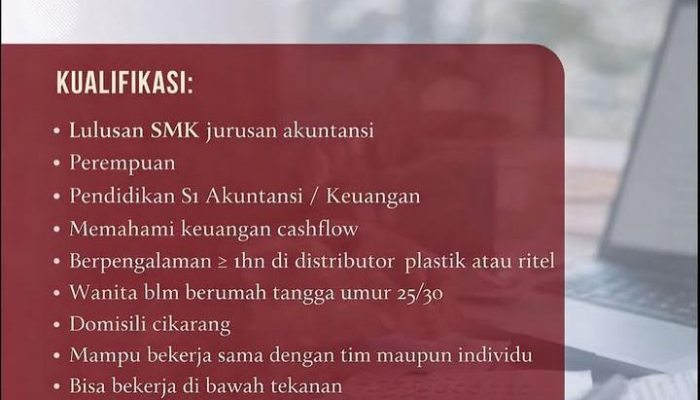 - Lulusan SMK Jurusan Akuntansi atau pendidikan S1 Akuntansi/Keuangan.