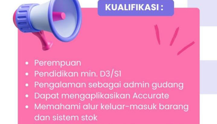 - Pengalaman: Memiliki pengalaman kerja sebelumnya sebagai Admin Gudang.