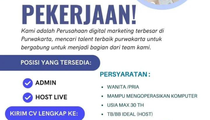 Apakah Anda talenta muda berbakat di Purwakarta yang ingin berkarier di dunia digital marketing? Sinergy Creative House, perusahaan digital marketing terbesar di Purwakarta, sedang membuka kesempatan emas bagi Anda untuk bergabung menjadi bagian dari tim dinamis kami. Kami mencari individu yang kreatif dan bersemangat untuk mengisi posisi Admin dan Host Live.