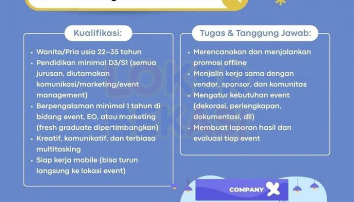 - Pengalaman: Minimal 1 tahun di bidang event, Event Organizer (EO), atau marketing (lulusan baru/fresh graduate yang potensial tetap dipertimbangkan).