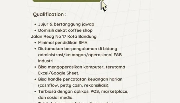 Kami mencari kandidat dengan minimal pendidikan SMA, berdomisili dekat coffee shop di Jalan Reog No 17 Kota Bandung, dan diutamakan berpengalaman di bidang administrasi/keuangan/operasional di industri F&B. Jika Anda teliti, komunikatif, dan mahir dalam handling keuangan harian, segera kirimkan resume Anda!