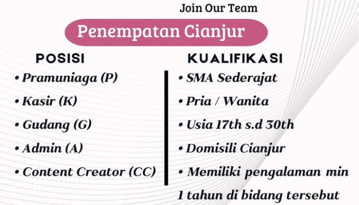 Aqila Food merupakan unit usaha yang bergerak di bidang makanan dan kuliner. Perusahaan ini terus berkomitmen untuk memberikan pelayanan terbaik kepada pelanggan setianya. Dalam rangka meningkatkan kualitas layanan dan operasional di cabang wilayah Cianjur, perusahaan memerlukan tambahan staf di berbagai lini, mulai dari pelayanan garis depan hingga manajemen konten kreatif.