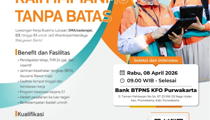 PT Bank BTPN Syariah Tbk kembali membuka peluang karir melalui program #BankirPemberdayaan bagi Anda yang ingin berkontribusi langsung bagi masyarakat. Kesempatan ini terbuka lebar bagi talenta muda di wilayah Purwakarta untuk bergabung dalam institusi perbankan syariah terkemuka di Indonesia.