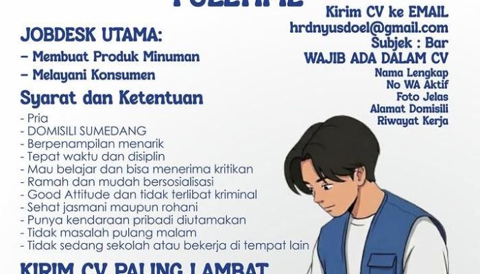 Kami mencari talenta yang komunikatif, disiplin, dan memiliki semangat belajar tinggi untuk memberikan pengalaman terbaik bagi setiap konsumen kami. Jika Anda ingin berkarir di lingkungan yang dinamis dan ramah, segera kirimkan lamaran Anda sebelum batas waktu berakhir!