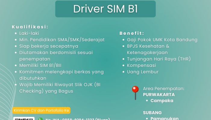 BEN Talent Center membuka peluang karier bagi Anda yang memiliki keahlian mengemudi dan berkomitmen tinggi untuk bergabung sebagai Driver SIM B1. Posisi ini tersedia untuk wilayah Purwakarta (Campaka) dan Subang (Pamanukan).