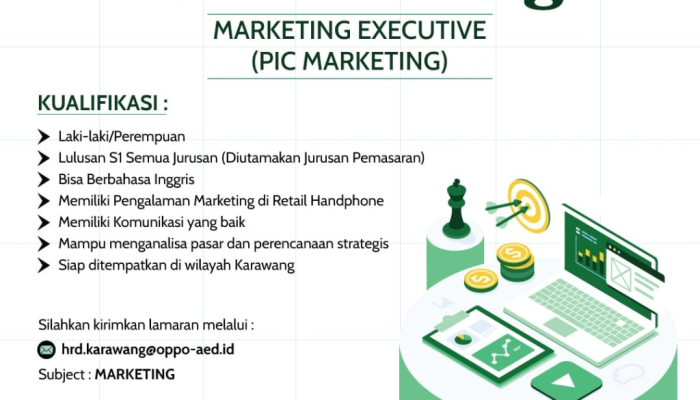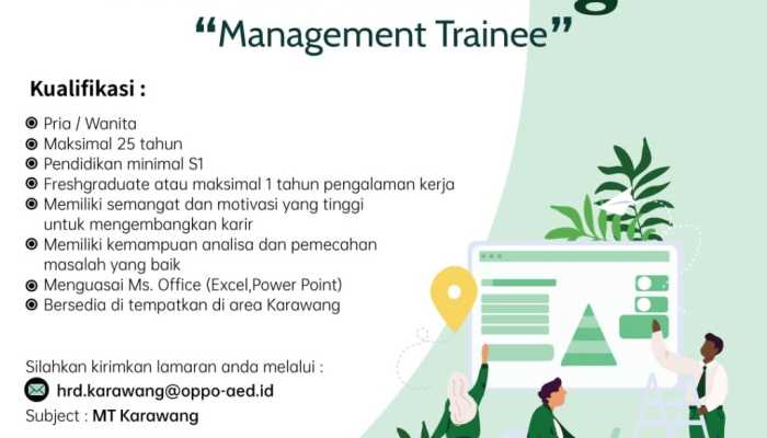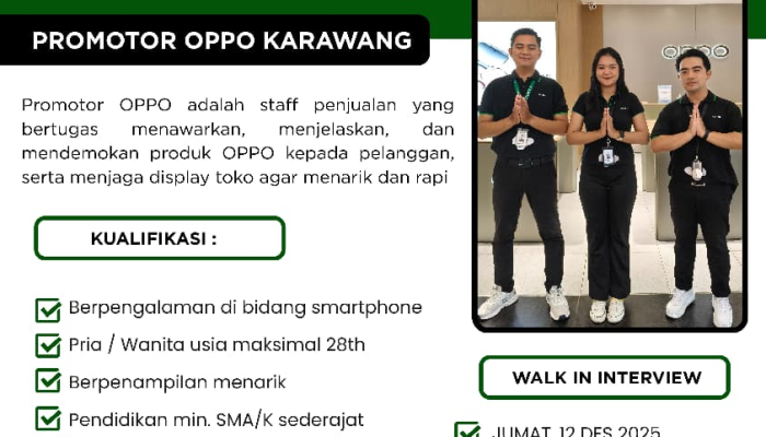 Karir impian Anda di industri teknologi dan telekomunikasi dimulai di sini! OPPO Karawang membuka peluang karir besar-besaran untuk talenta-talenta terbaik yang energik, bersemangat, dan siap berkembang. Tersedia empat posisi menarik, mulai dari Promotor yang dinamis, hingga posisi strategis Management Trainee, Staff Branding, dan Marketing Executive. Jika Anda berdomisili atau siap ditempatkan di Karawang dan ingin bergabung dengan Authorized Exclusive Distributor dari brand smartphone ternama, segera simak kualifikasi lengkapnya dan tentukan karir pilihan Anda!