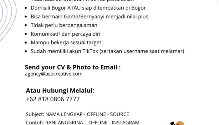 Apakah kamu pribadi yang komunikatif, percaya diri, dan hobi tampil di depan kamera? PT Arah Sinergi Nusantara (ASO) sedang membuka peluang karir menarik bagi talenta muda untuk bergabung sebagai Live Creator Streaming (Offline Talent) di Bogor.