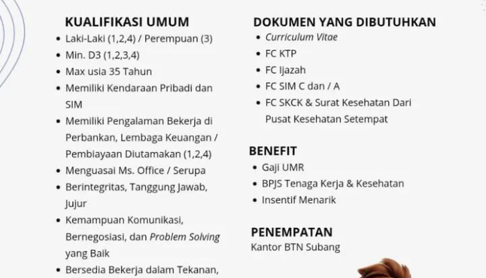 Lokasi Kerja: Kantor BTN Subang, Jawa Barat. Deadline: Segera lakukan pendaftaran sebelum kuota terpenuhi (disarankan sesegera mungkin).
