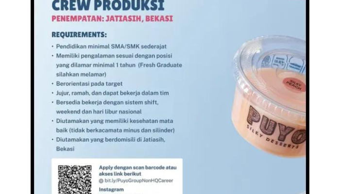 Apakah Anda sedang mencari peluang karir di industri makanan dan minuman (F&B) yang sedang berkembang pesat? Puyo Silky Desserts, pionir puding sutra di Indonesia, saat ini sedang membuka kesempatan berkarir bagi Anda yang dinamis dan bersemangat untuk bergabung sebagai Crew Produksi untuk penempatan di wilayah Jatiasih, Bekasi.