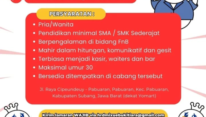 - Kirimkan surat lamaran dan CV terbaru Anda ke alamat email: hrdmixuebukitiara@gmail.com