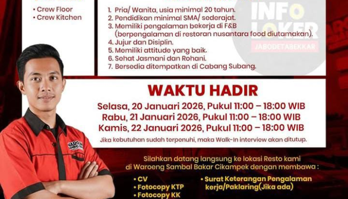 Apakah Anda seorang profesional di bidang F&B yang sedang mencari tantangan baru? Waroeng Sambal Bakar sedang membuka kesempatan emas bagi Anda untuk bergabung sebagai bagian dari tim cabang terbaru kami di Subang. Kami mengundang individu-individu yang bersemangat, jujur, dan disiplin untuk hadir dalam sesi Walk-In Interview yang akan segera dilaksanakan. Jangan lewatkan kesempatan untuk membangun karir bersama salah satu jaringan resto sambal bakar terpopuler saat ini!