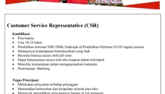 Bagi Anda yang sedang mencari peluang karier di bidang layanan pelanggan, Circle K Bandung kembali membuka kesempatan untuk posisi Customer Service Representative (CSR). Posisi ini sangat cocok bagi lulusan muda yang energik, komunikatif, dan siap bekerja dalam lingkungan ritel yang dinamis. Simak informasi lengkapnya berikut agar Anda tidak melewatkan kesempatan menarik ini!