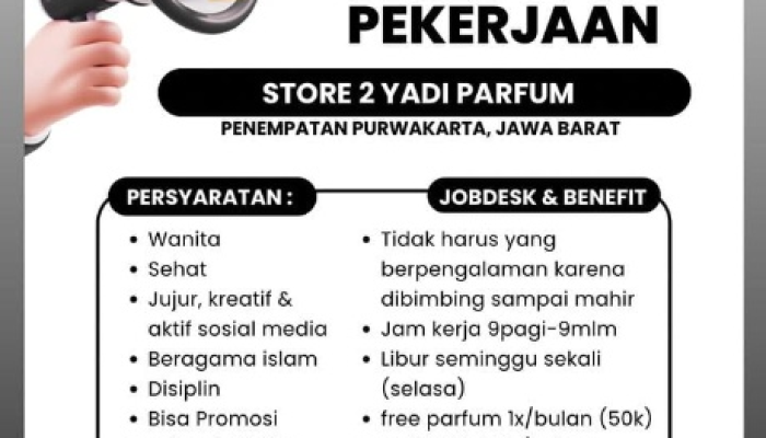 Apakah Anda seorang wanita yang kreatif, aktif di media sosial, dan sedang mencari peluang karir di dunia wewangian? Yadi Parfum, salah satu destinasi parfum populer, kini kembali membuka kesempatan kerja bagi Anda untuk bergabung sebagai bagian dari tim Store 2 Yadi Parfum Purwakarta. Ini adalah kesempatan emas bagi Anda yang ingin bekerja di lingkungan yang wangi, dinamis, dan penuh keceriaan. Simak informasi lengkap mengenai kualifikasi dan cara pendaftarannya di bawah ini.