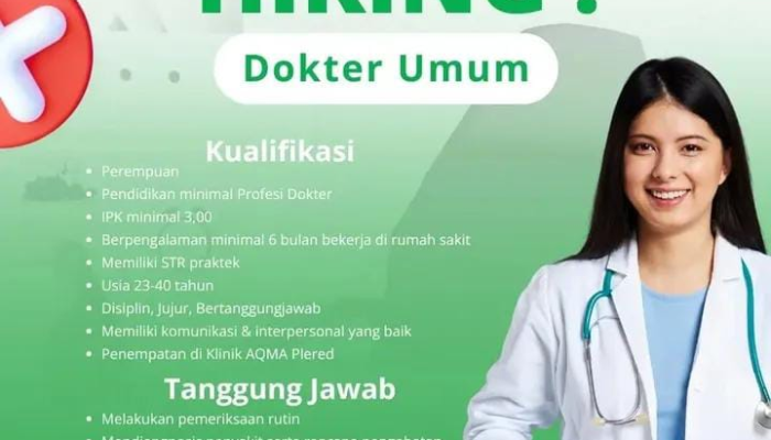 Apakah Anda seorang tenaga medis profesional yang berdedikasi untuk memberikan pelayanan kesehatan terbaik bagi masyarakat? Klinik AQMA, pusat layanan kesehatan terkemuka, kini sedang membuka kesempatan karir bagi Anda untuk bergabung dalam tim medis kami sebagai Dokter Umum untuk penempatan di cabang Plered.