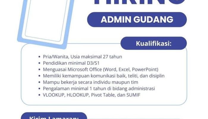 Apakah Anda sedang mencari peluang karir di bidang operasional gudang dan administrasi? Enjoy Network Cakrawala saat ini sedang membuka kesempatan berkarir bagi talenta muda yang berdedikasi dan memiliki semangat kerja tinggi. Kami mengundang Anda untuk bergabung mengisi posisi strategis dalam tim kami melalui rekrutmen terbaru bulan ini. Jangan lewatkan kesempatan emas ini untuk berkembang bersama jaringan bisnis kami yang terus bertumbuh!