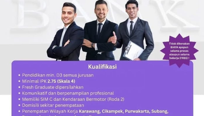 Melalui kantor cabang kami di Purwokerto, kami secara resmi membuka rekrutmen untuk posisi Field Collection yang akan ditempatkan di berbagai wilayah strategis di Jawa Barat. Posisi ini terbuka lebar bagi lulusan baru (fresh graduate) yang ingin mendapatkan pengalaman berharga di dunia perbankan.