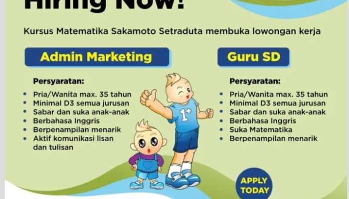 Apakah Anda memiliki minat besar dalam dunia pendidikan anak-anak dan ingin berkarir di lembaga kursus internasional? Kursus Matematika Sakamoto Setraduta Bandung membuka kesempatan berkarir bagi para profesional muda yang komunikatif dan berdedikasi untuk bergabung sebagai tim kami di tahun 2026 ini. Kami mencari individu yang sabar, ceria, dan siap membantu anak-anak mengembangkan logika serta kreativitas mereka melalui metode Sakamoto yang sudah mendunia.