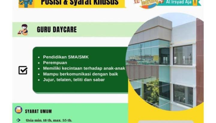 • Guru Daycare: Minimal pendidikan SMA/SMK (khusus perempuan), memiliki kecintaan terhadap anak-anak, komunikatif, jujur, telaten, teliti, dan sabar.