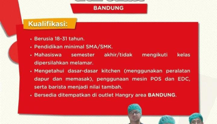 - Untuk Crew Outlet: Daftar secara online melalui tautan bit.ly/formpelamarhangry atau scan QR Code yang tersedia pada poster.