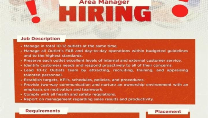 - Pengalaman kerja minimal 3 tahun sebagai Area Manager yang berspesialisasi dalam Layanan F&B/Restoran atau setara.