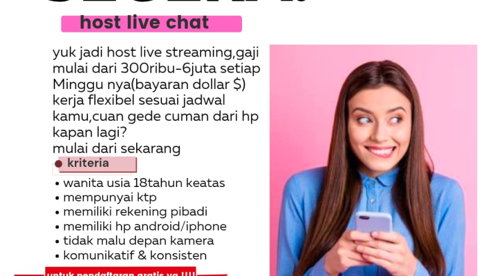 Sebagai Host Live Streaming atau Host Live Chat, tugas Anda adalah berinteraksi dengan audiens secara langsung melalui siaran di berbagai platform. Anda akan menjadi host yang ramah dan konsisten, membangun hubungan dengan penonton, dan menciptakan sesi live yang menarik.