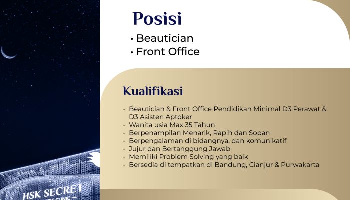 HSK Secret Aesthetic Clinic sedang mencari kandidat terbaik untuk dua posisi kunci yang sangat penting dalam operasional klinik: