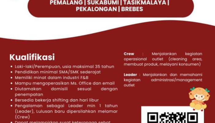 Lowongan ini terbuka bagi lulusan SMA/SMK sederajat, baik yang sudah berpengalaman maupun fresh graduate (untuk posisi Crew). Jika kamu memiliki minat bekerja di lingkungan outlet F&B yang dinamis, profesional, dan bertumbuh, maka peluang ini sangat cocok untuk kamu!