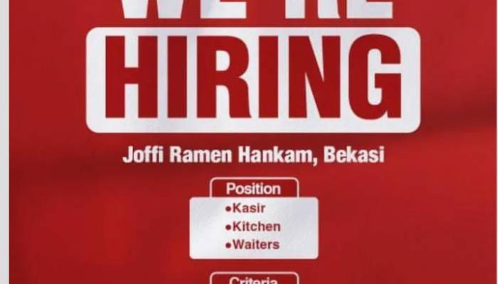 Apakah Anda berdomisili di Bekasi dan memiliki gairah tinggi di dunia Food & Beverage (F&B)? Joffi Ramen Hankam, bagian dari Dikwaa Group Indonesia, saat ini sedang mencari individu-individu berbakat, energik, dan berkomitmen untuk bergabung menjadi bagian dari tim operasional kami.