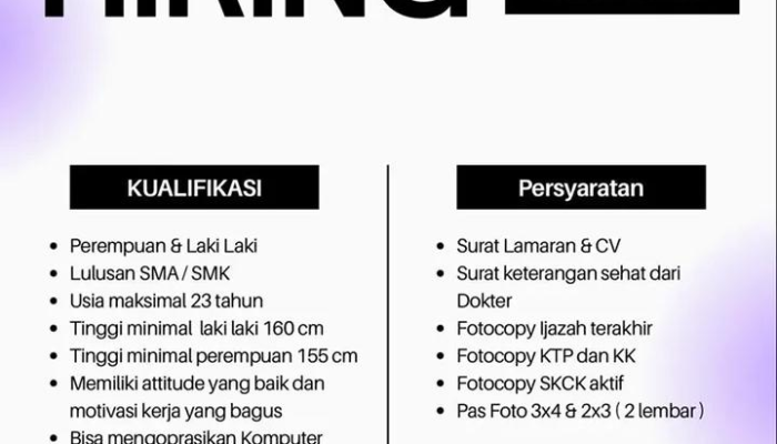 - Pendidikan: Lulusan minimal SMA/SMK Sederajat.